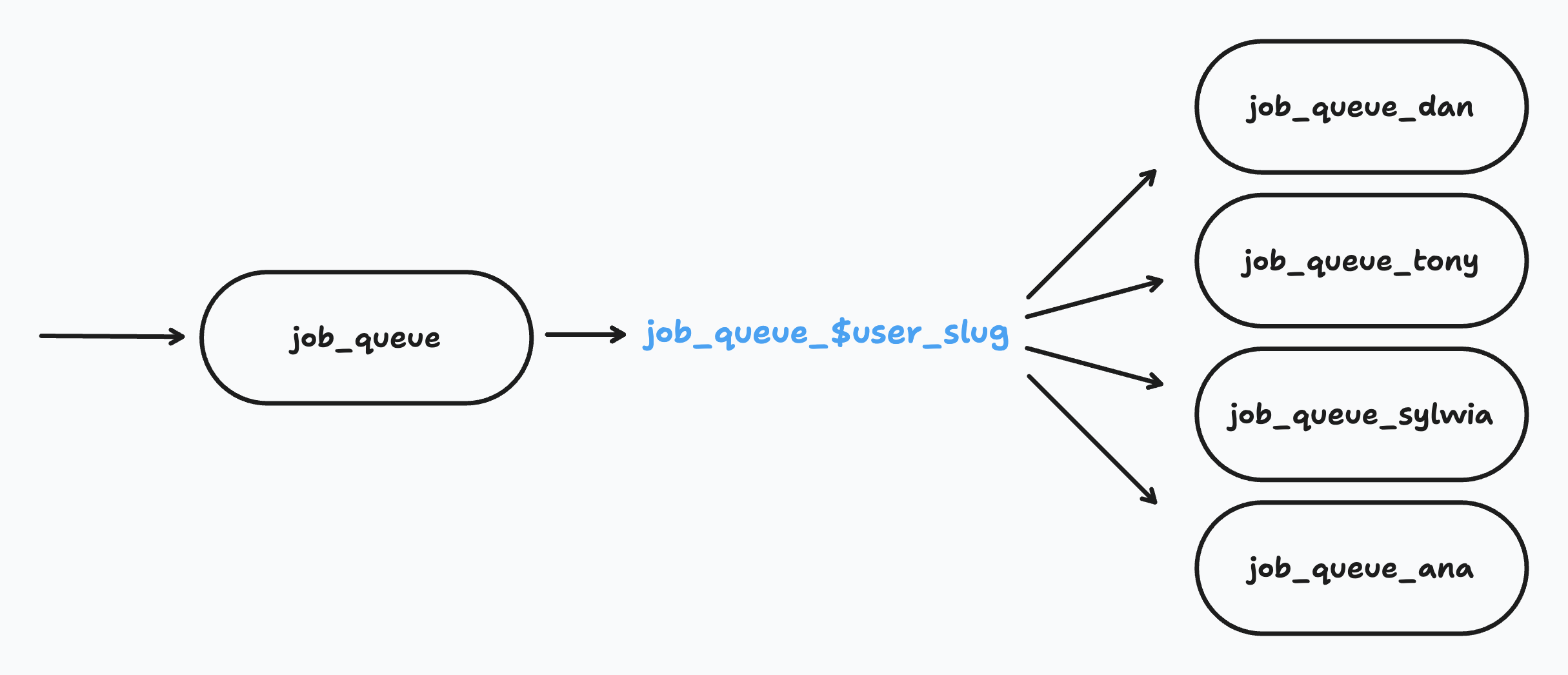 A visualization of a single queue fanning out into a queue per user