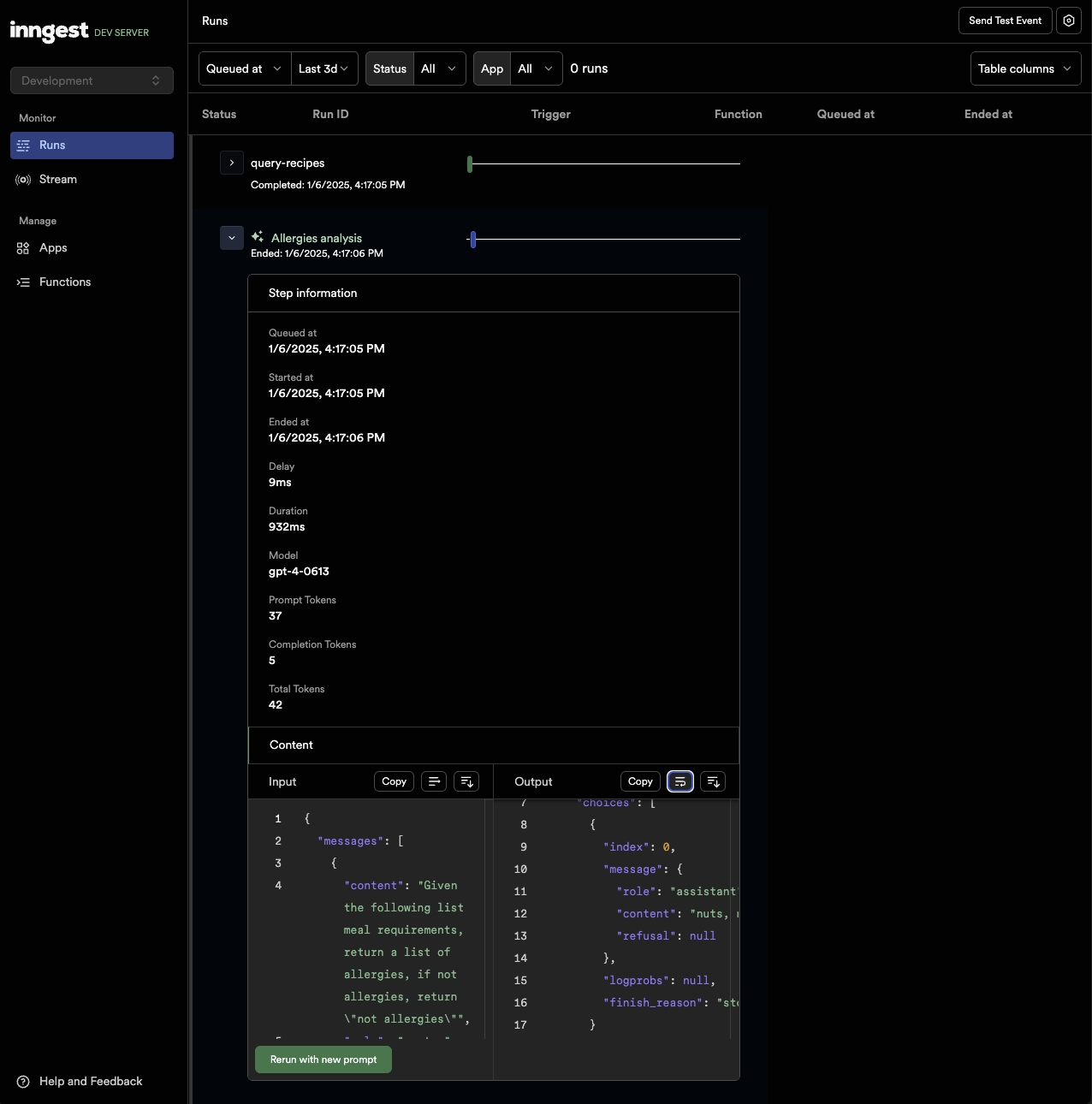 The LLM requests get highlighted in the Inngest DevServer (your local version of Inngest), enabling you to inspect the token usage, the input and output of the LLM, and re-run the given step with a new prompt.