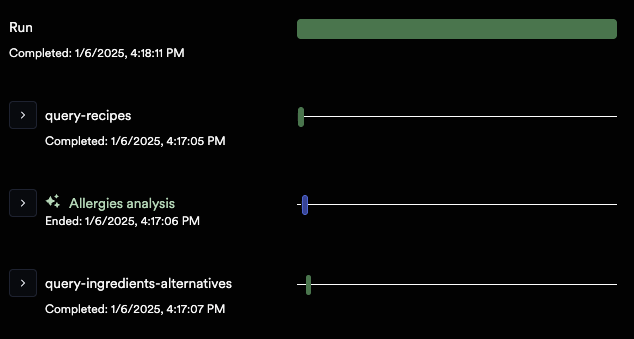 Starting our dinner generator workflow with food preferences including ”no nuts” triggers the "query-ingredients-alternatives" Weaviate query step based on the detection of the "Allergies analysis" LLM step.